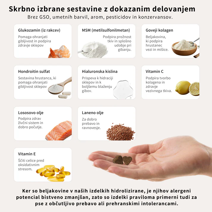 SESTAVINE: inaktivirane pivske kvasovke, krompirjev škrob, rastlinski glicerin, krompirjevi kosmiči, posušena jabolčna kaša, glukozamin iz živalskih tkiv (rakci), metilsulfonilmetan (MSM), lososovo olje, rafinirano kokosovo olje, tapioka moka, goveji kolagen, hidrolizirani živalski proteini, rožič v prahu, hondroitin sulfat, hialuronska kislina, laneno olje.
